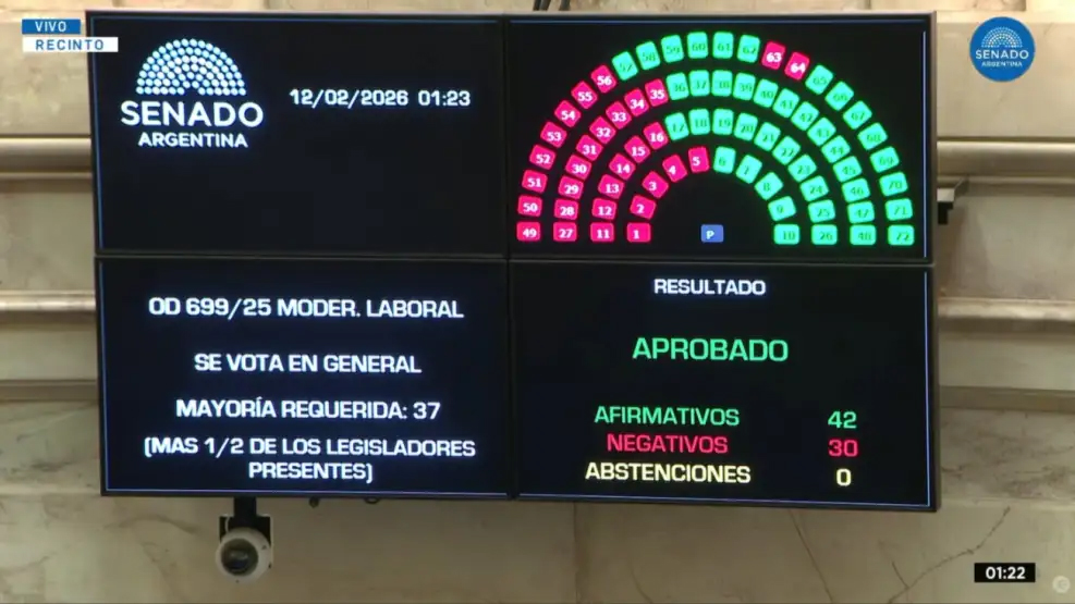 El Gobierno de Javier Milei consiguió aprobar en el Senado, de manera general y particular, la Reforma Laboral durante la madrugada de este jueves 12 de febrero, con 42 votos a favor, 30 en contra y sin abstenciones. Para conseguirlo, hizo concesiones tanto a los gobernadores aliados como a la CGT (Confederación General del Trabajo), que resistió varios puntos del articulado. Como protesta, los gremios habían realizado, la tarde del miércoles, una marcha hacia el Congreso.